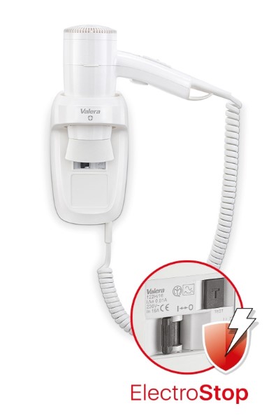 Fen za kosu 1200 W • 6 kombinacija temperature/brzine • Ripple wire SECURITY grejači element • Zidni držač sa ELECTROSTOP sklopkom 10mA • Zidna montaža • Automatski ON/OFF sigurnosni prekidač • Swiss made